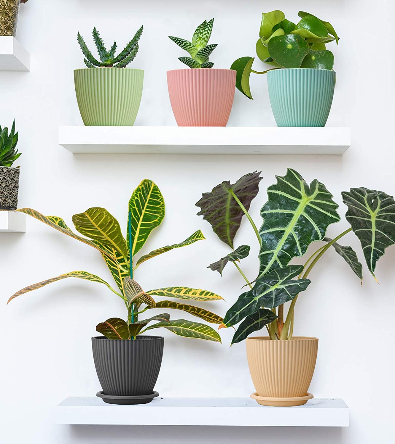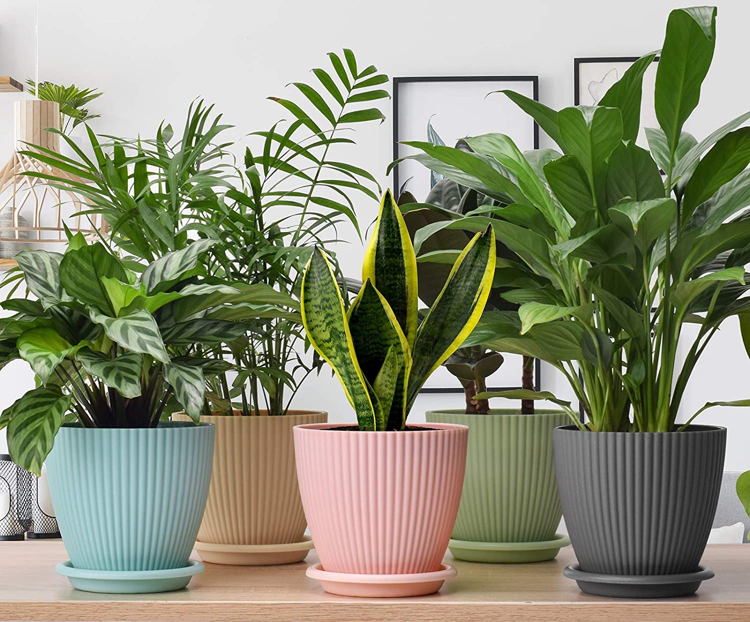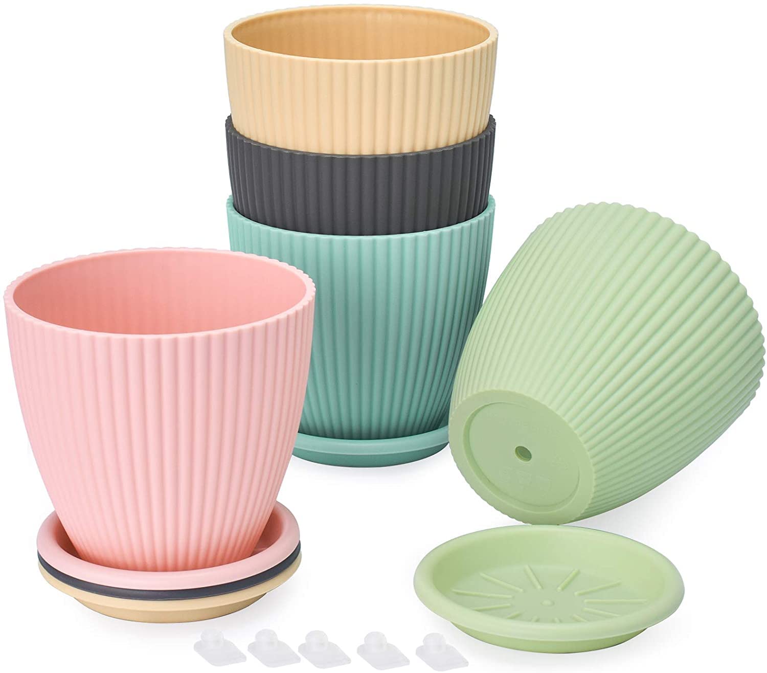 Set of 5 durable plastic plant pots with matching saucers.