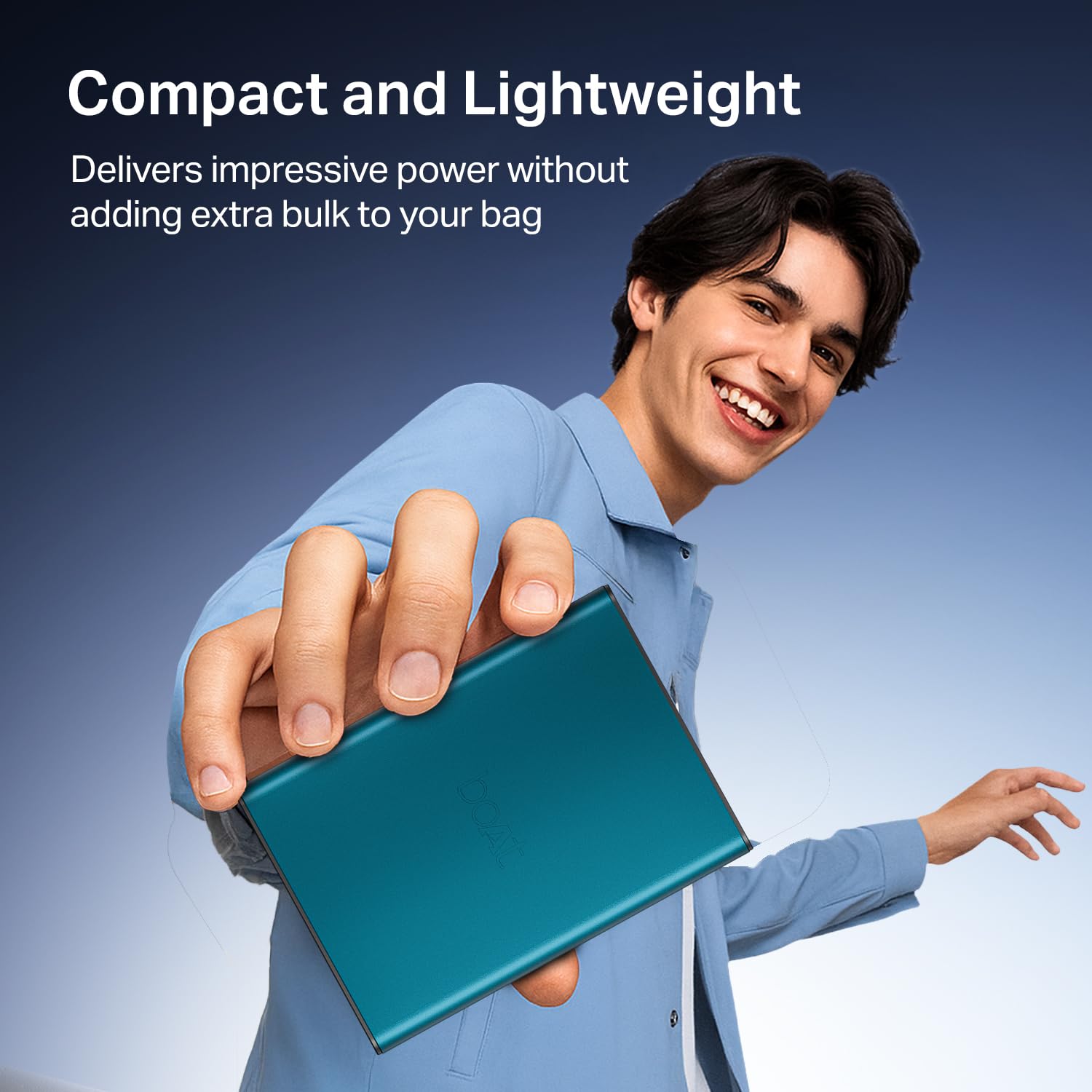 Includes 1 Type-C (2-way) and 2 USB-A ports for charging multiple devices. - Compact & Pocket-Friendly Design
