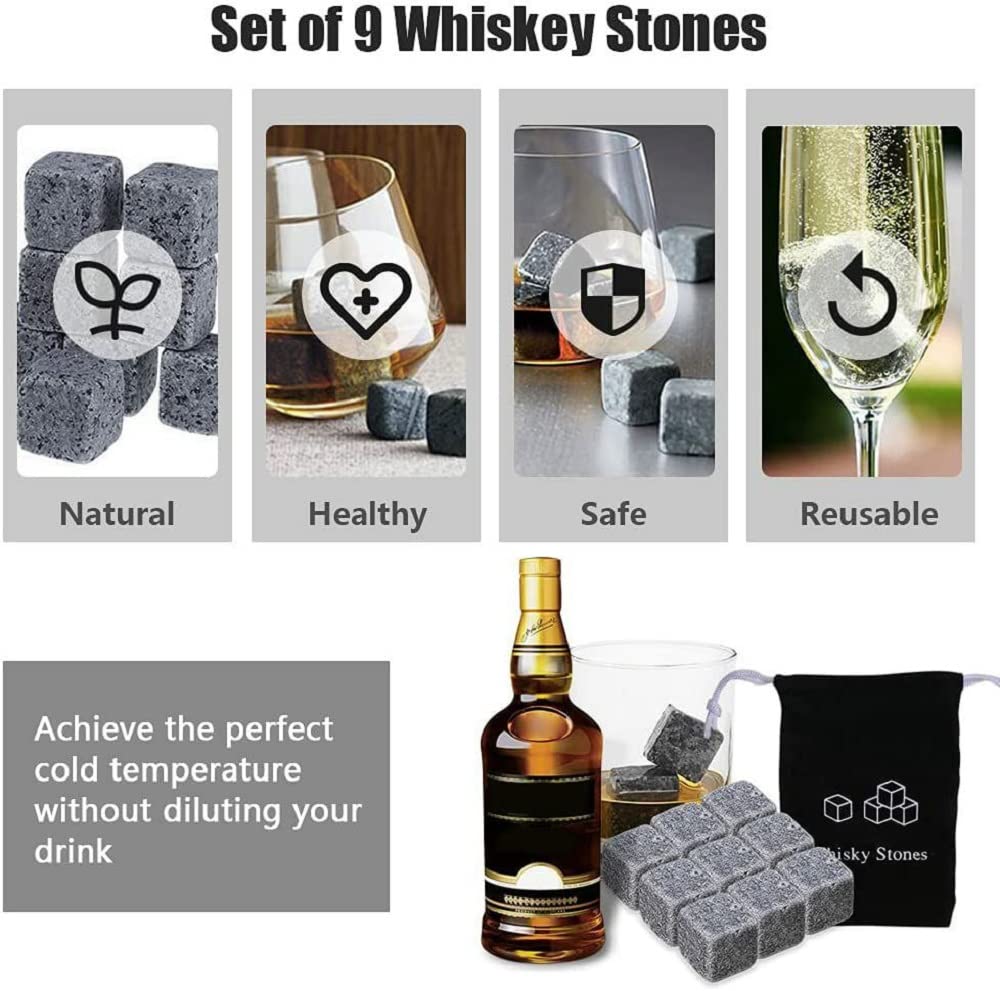 Premium Natural Marble Stones: Crafted from high-quality Toros Black marble, these whisky stones feature a unique texture and elegant appearance, making them a stylish addition to any barware collection. Each set includes carefully selected pieces designed for long-lasting use.